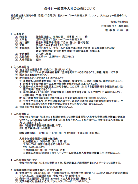 社会福祉法人湘南の凪 では、(仮称)沼間3丁目障がい者グループホーム新築工事について、